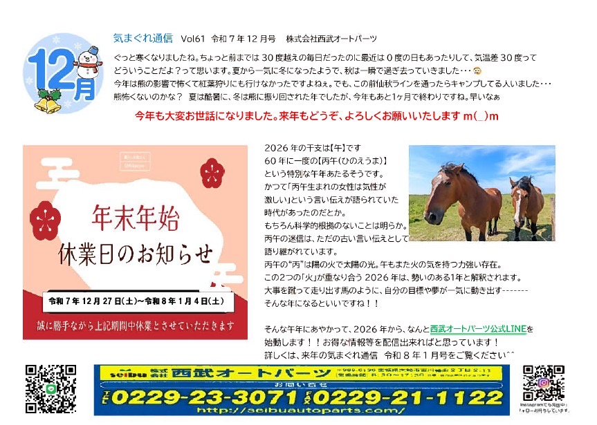 西武オートパーツの年末年始のお休みは12/27(土)~1/4(日)になります🙇♂️